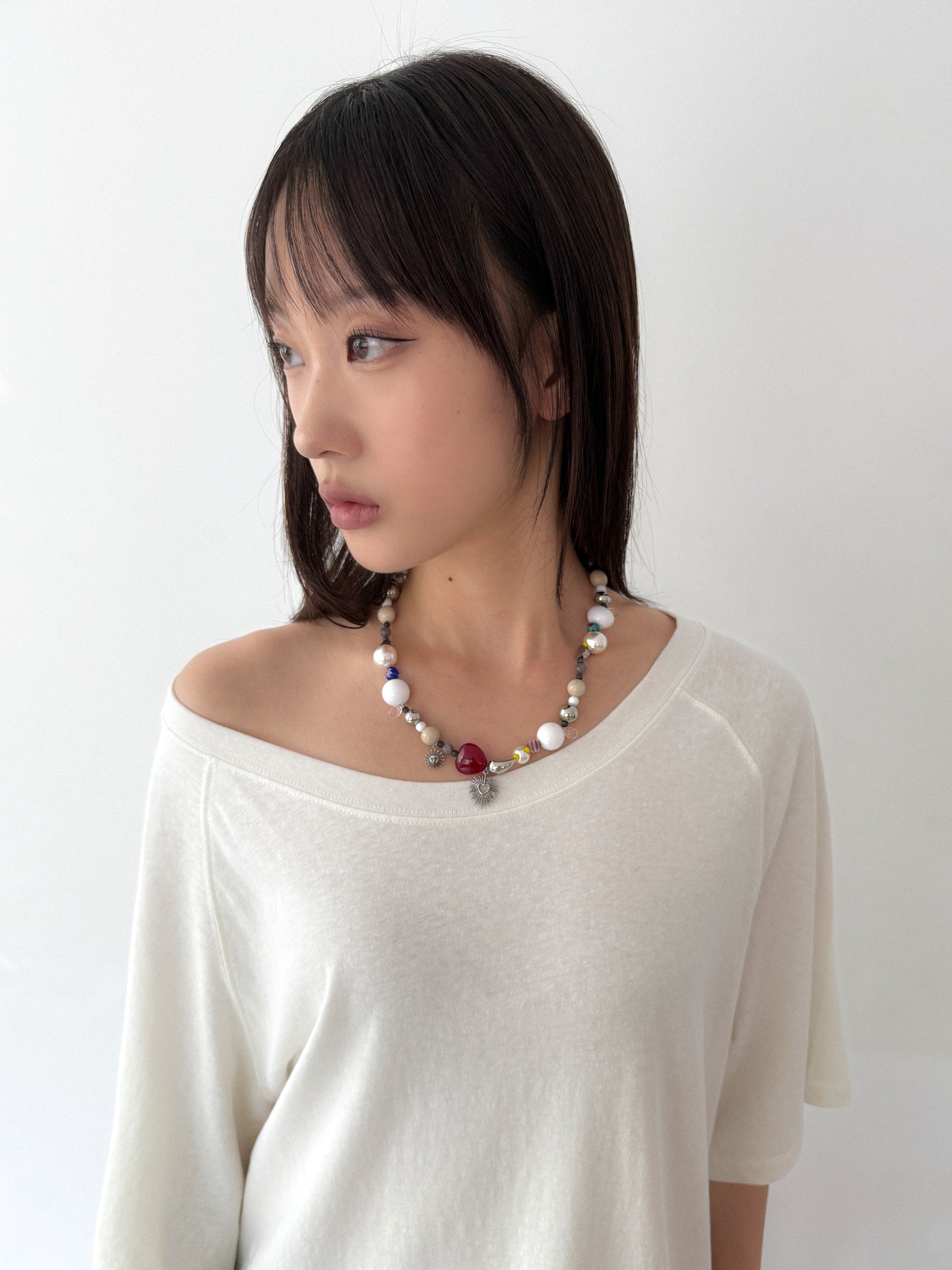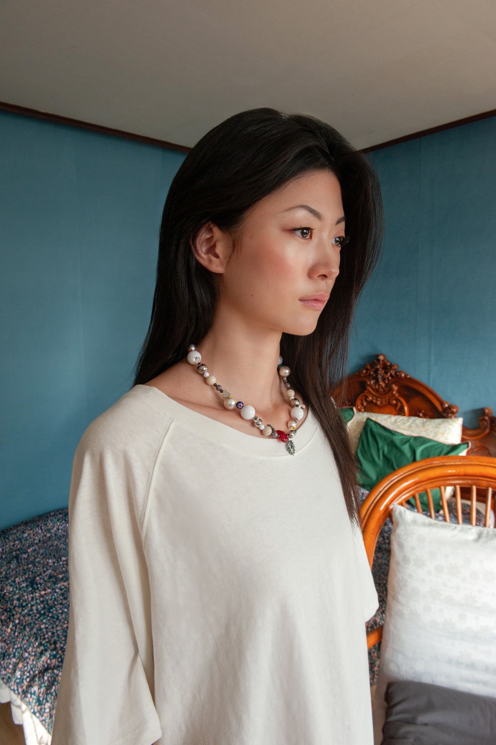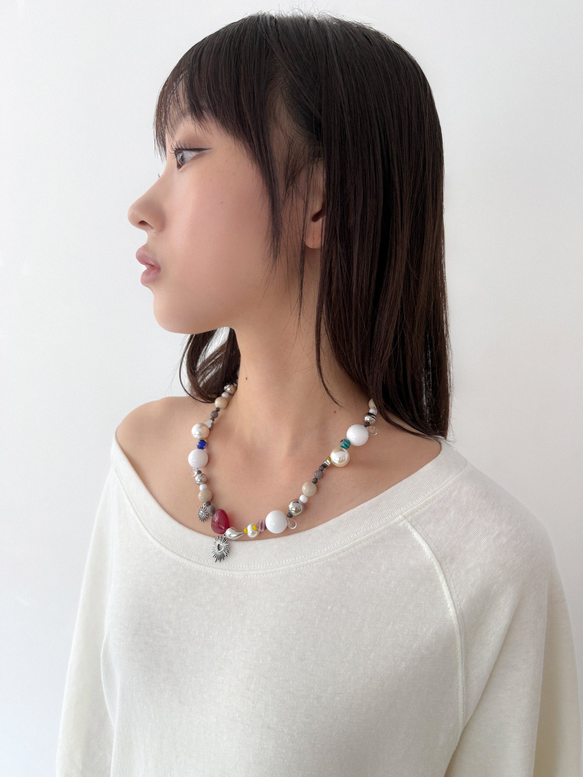 Beaded necklace featuring mixed jade, natural stone, acrylic beads, and surgical steel in multicolor.